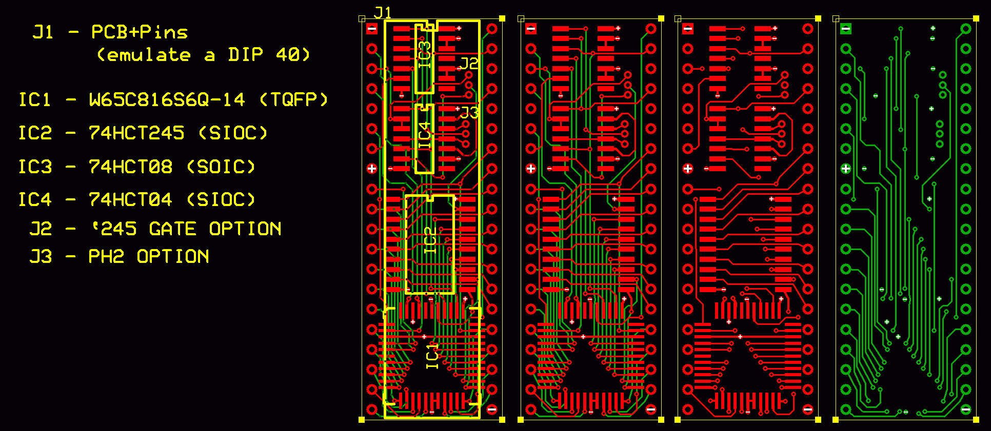 Now, the hard part. We wanted to keep the size of our adapter as small as possible. By using SOIC versions of IC2,3,4, and the TQFP version of 65816, it became possible to squeeze the entire circuit into the size of a DIP40.