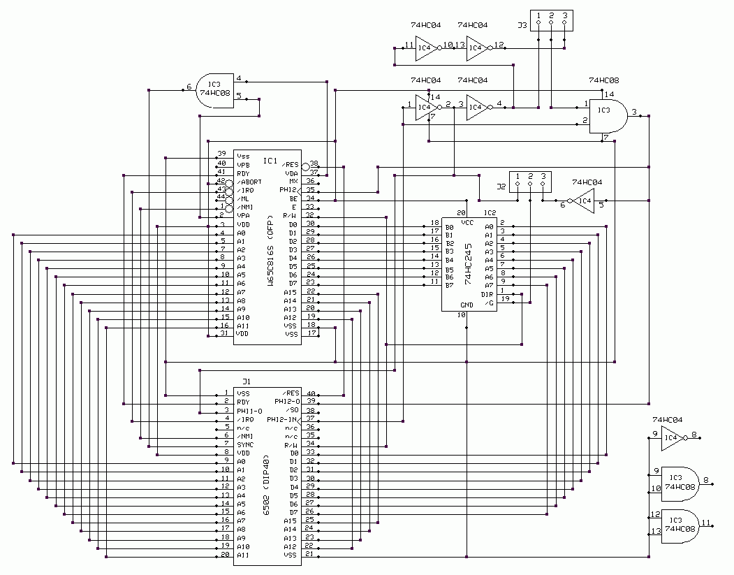 There has been some interest in using a WDC 65C816 processor in a system that was designed for a 6502. However, the two are not pin for pin compatible. Some form of adapter is required. With some suggestions from the users on the 6502 Forum, I created a working schematic for an adapter. IC3 and IC4 are used to create the two-phased clock output PH1 and PH2 that the 65816 does not generate. IC2 is used to keep the data bus at high-impedance during PH1.