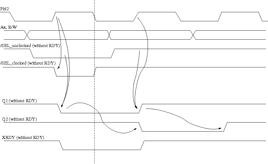 The main IC used for the generation is the shift register 74LS164. It is clocked with the Phi2 clock signal, and shifts the /SEL_unclocked signal through its output signals. With a combination of the output signals the new XRDY signals is created. The timing diagrams below show how it works.