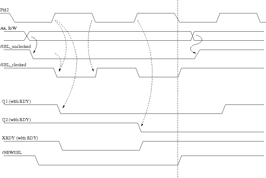 The /SEL_clocked line now shows two active periods, as it is combined with Phi2 that is going inactive during Phi1. Therefore the /NEWSEL line is generated using the /SEL_clocked and XRDY line.