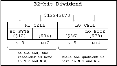 To start, the 32-bit dividend is in N+2 (byte 2), N+3 (byte 1, or hi byte), N+4 (byte 4, or lo byte), & N+5 (byte 3).