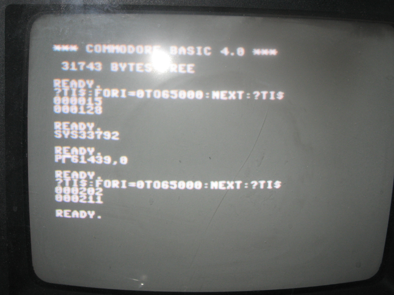 Screenshot of a timing measurement. On the top of the screen you see the result of the original speed, then copying (SYS33792 where I assembled the test to), then POKEing the control register to fast speed and measuring again.