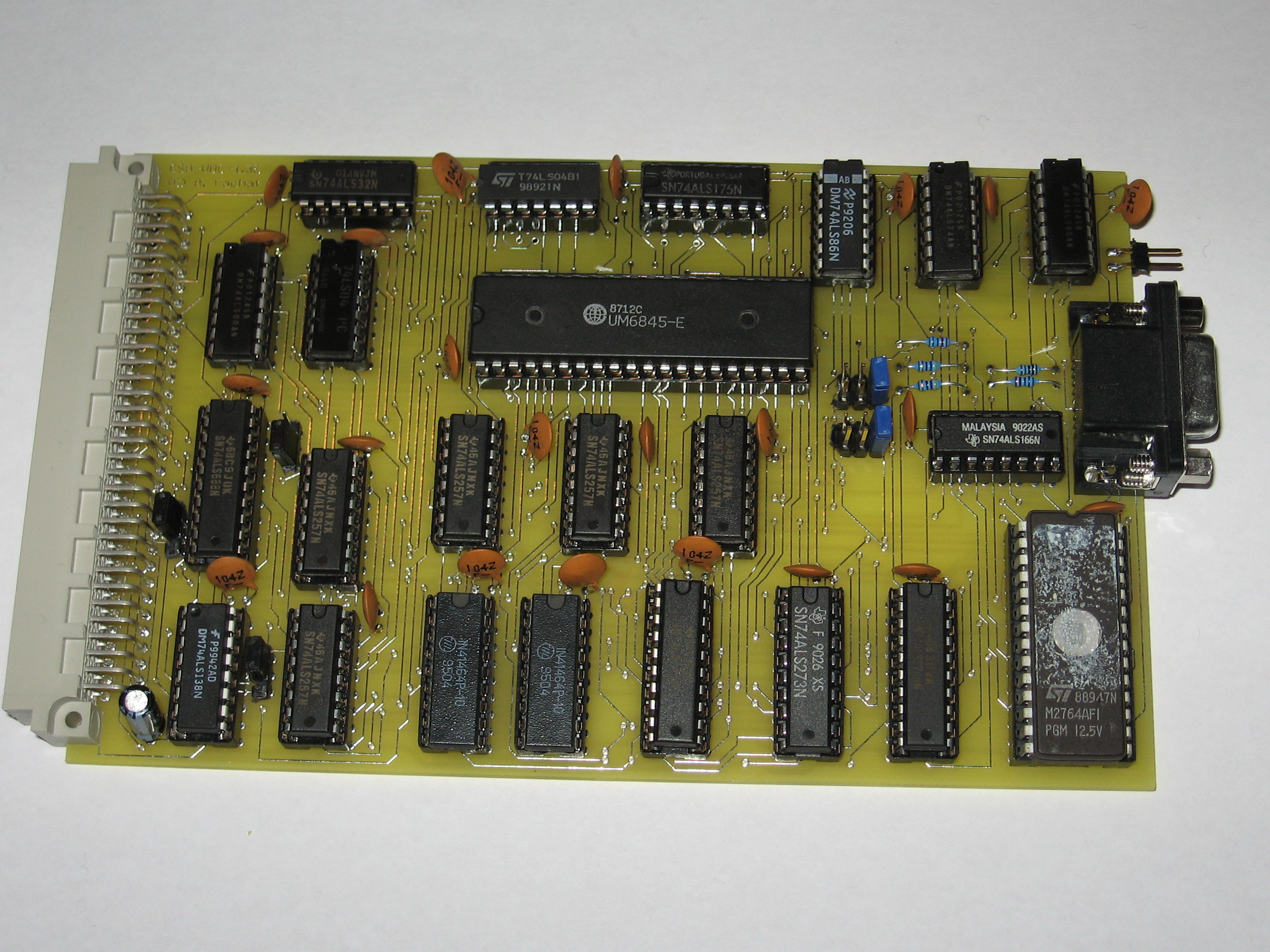 | Most of the TTL chips are 'ALS technology, but a few have to be 'LS for timing requirements: IC9 is a 74LS245 so that the data read from the RAM is held on the bus longer, as the CPU requires a certain hold time of that data. IC21 is a 'LS so that the delay between /RAS and /CAS is still long enough. IC9 may probably be an 'ALS04 as well, but never change a running system... |