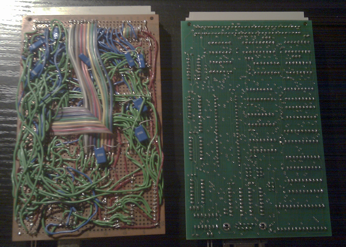 | In my current setup I have reused my 20 year old original video board (which wasn't working anymore). So all timing relevant ICs are 'LS technology ('LS04, 'LS00, 'LS74, 'LS257, 'LS32, 'LS138, 'LS86, 'LS175, 'LS166). The only exceptions are a 'HCT688 and a 'HCT245. Maybe I've finally defeated the dRAM timing hell here.... |