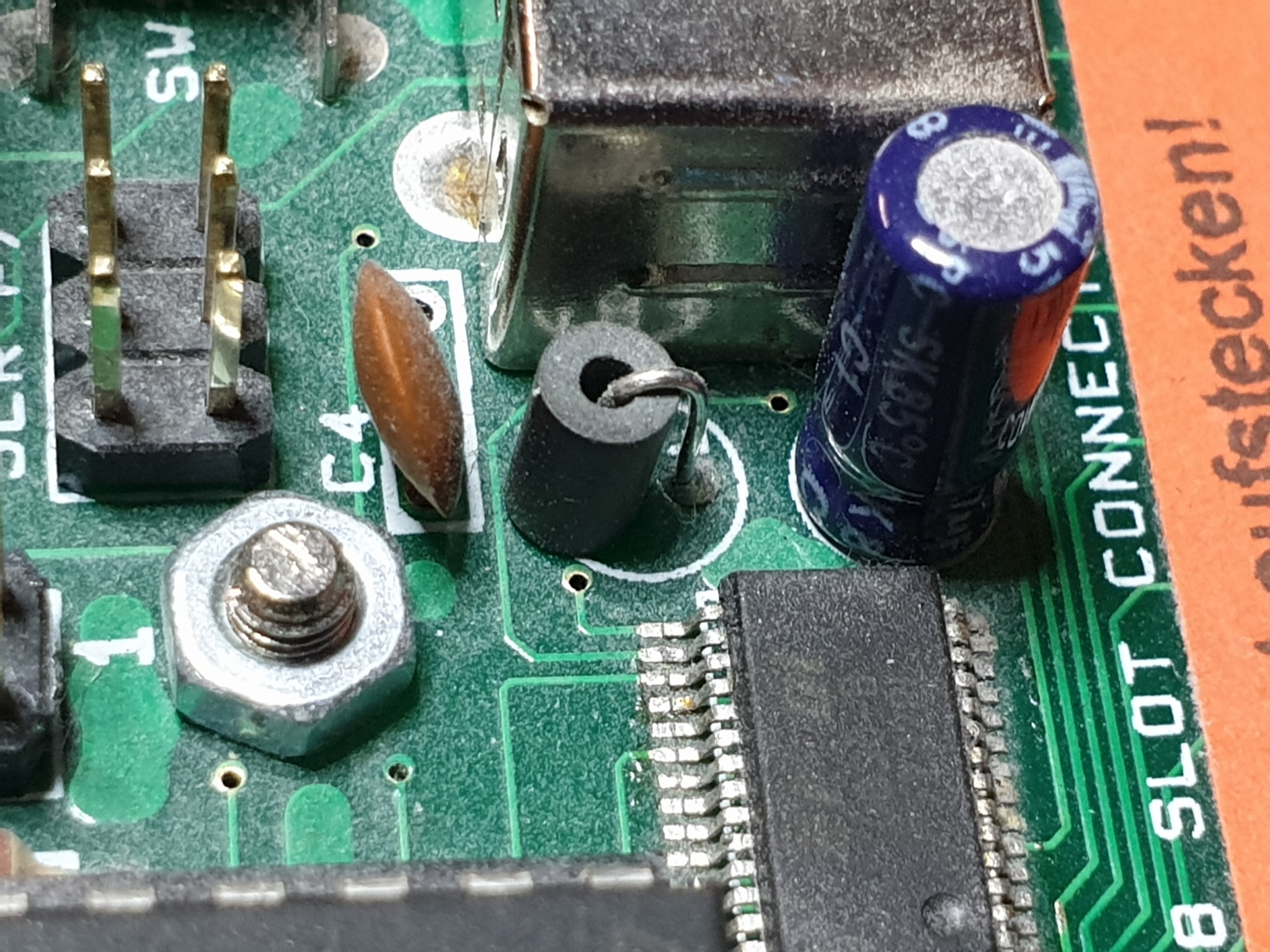 Please note that C4 on the board has three holes, even though a capacitor only has two connections. This is made such that you can use parts with a 2.5mm or with a 5mm pin distance. Just put one pin in the one of the three holes that is separated in the silkscreen print, and use one of the other holes as fits.